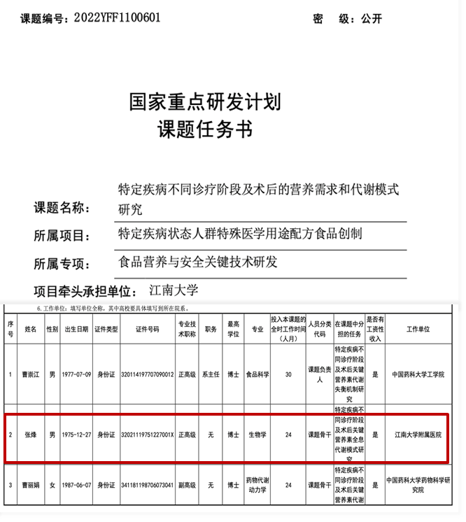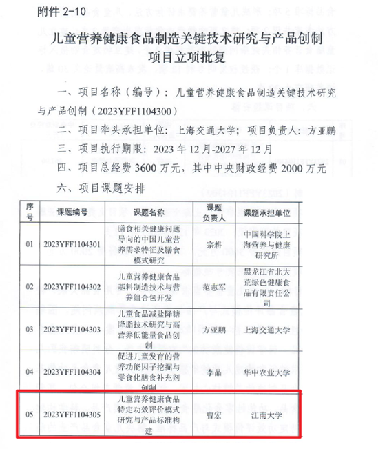 曹宏教授张烽教授团队参与申报的“十四五”国家重点研发计划项目“儿童营养健康食品制造关键技术研究与产品创制”成功获批立项,该项目由上海交通大学牵头,项目总经费3600万元,其中中央财政专项资金资助2000万元。曹宏教授作为课题五负责人主持“儿童营养健康食品特定功效评价模式研究与产品标准构建”,团队成员李丹博士、闫继爱博士和孙静博士分别作为子课题负责人参与该项目中。这是继2022年张烽教授作为子课题负责人参与国家重点研发计划“特定疾病状态人群特殊医学用途配方食品创制”后,营养科团队取得的又一突破性成果。