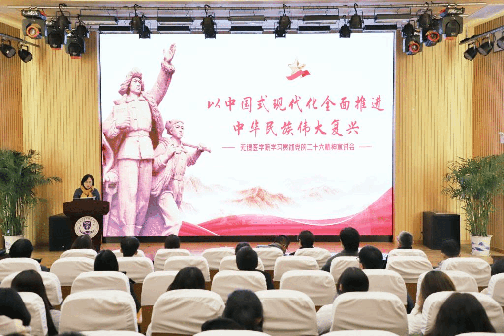 特邀马克思主义学院教授唐忠宝以《以中国式现代化全面推进中华民族伟大复兴—学习贯彻党的二十大精神》为题,在学院C101报告厅,为党委中心组成员、教职工党员、民主党派成员、学生党员等90余人做了专题报告,报告由党委书记向琪主持。
