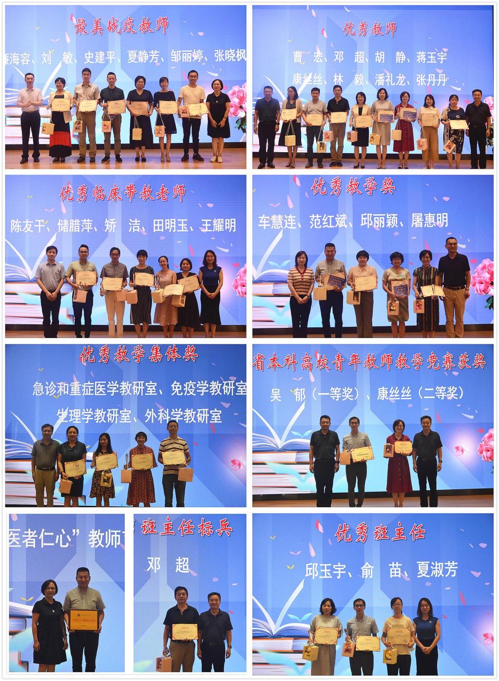 /附属医院教师节庆祝大会表彰名单》。学院表彰了2019-2020年度最美战役教师6名、优秀教师8名、优秀临床带教老师5名、优秀教学奖4名和优秀教学集体4个、省本科高校青年教师教学竞赛获奖教师2名、“医者仁心”教师育人工作室1个、优秀班主任标兵1名、优秀班主任3名。与会领导向获奖老师和集体颁发证书并合影。