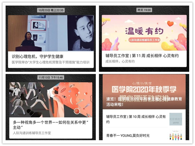 10月至11月,以“学习有效沟通,提升人际关系”为主题的多场团辅、“新起点,心动力”心理班会课、“心沟通,新成长”主题微文宣传等活动先后在医学院顺利进行。学院围绕心理危机干预、新生入学适应、人际关系沟通等主题累计策划和组织了包括主题培训、主题讲座、主题团辅、主题宣传、主题咨询等在内的五大类近20场心理健康教育活动。丰富多彩的活动覆盖了学院全体本科生新生和研究生新生,众多的高年级学生、研究生导师和专任教师也积极参与其中,参与对象涉及广泛。