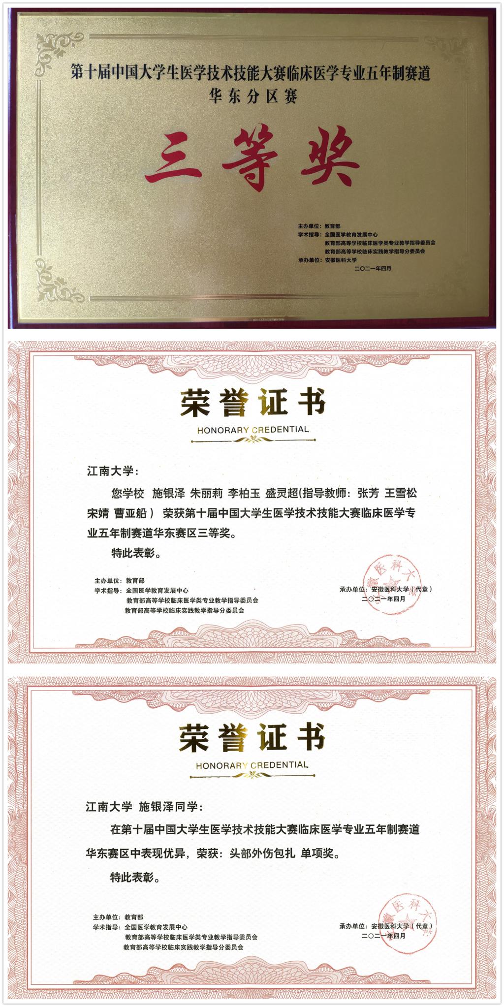 医学院临床2016级学生施银泽、朱丽莉、李柏玉和盛灵超代表学校参加比赛,其缜密的临床思维、娴熟的临床技能和扎实的知识储备受到了现场专家评委的一致好评,展现出了江南学子的风采和素养,并最终以团体第15名的优异成绩荣获三等奖。其中,施银泽同学在“头部外伤包扎”操作中反应灵敏迅捷,决策正确果断,操作规范熟练,表现极其突出,被授予该操作单项奖,也使得桃花视频