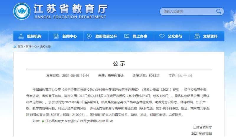 为进一步促进国家乡村振兴战略,江苏省高教学会高校成人教育研究会理事长会议研究倡议,并经省教育厅同意,在全省高校征集助力乡村振兴在线开放课程,要求围绕推动乡村产业、人才、文化、生态和组织振兴的总要求,结合本校学科专业特长,面向广大农民和农村工作者,推荐针对性、实用性强的在线开放课程资源,设置了十大课程模块,本次入选的课程视作“省级高校在线开放课程”。经学校推荐申报、专家认定、省教育厅审核,确定入围课程1042门,其中桃花视频