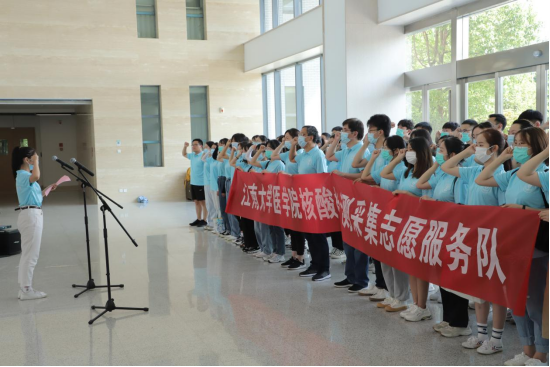 据悉,医学院通过紧急招募疫情防控应急储备青年志愿者,已完成第一批、第二批共计101名志愿者的招募,其中包括医学院院领导、教授、青年教师、博士及本硕生。医学院和附属医院组织完成了2期岗前专业培训。今日,医学院派出首批75名志愿者下社区进行多项疫情防控志愿服务工作。疫情就是命令,防控就是责任。志愿者一句句铿锵有力的宣誓声,唱响了向疫情宣战的决心。使命在肩,自当奋勇向前,医学院将在学校的领导和支持下,全力做好无锡市卫健委在疫情防控期间安排的志愿服务任务,为无锡地区疫情防控工作贡献应有的力量。