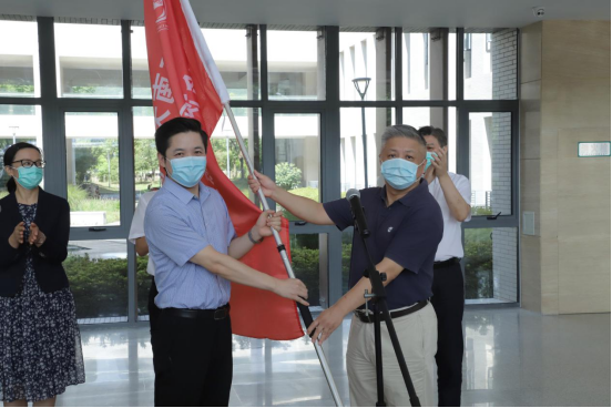 校党委常委、副校长徐岩为志愿者代表医学院院长马鑫授旗