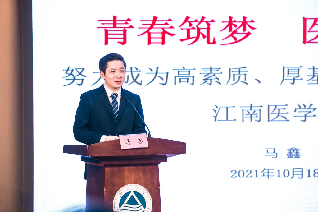 本次见面会还设置医学院特色的佩戴医学院院徽、赠送听诊器仪式,在场的领导老师亲手为新生代表佩戴院徽并赠与听诊器。吕国忠主任带领同学们集体宣读医学生誓词,以此来勉励大家厚德博学、勤业济世,成为一名优秀的江南医学生。临床2103班王艺璇、研究生华雨绮,分别代表本科新生和研究生先生进行了发言。