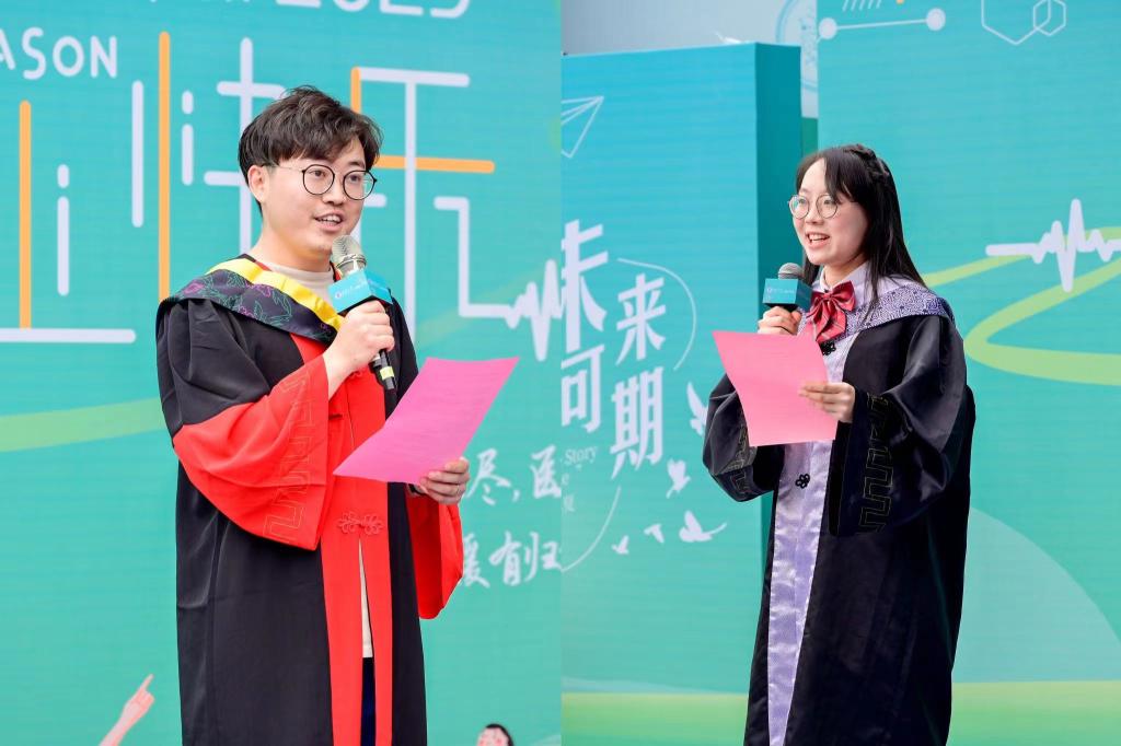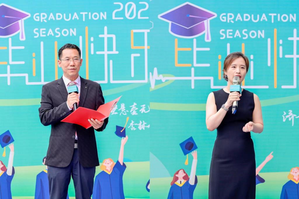研究生导师庞庆丰、临床1802班班主任徐非作为教师代表回顾了与同学们相处的美好过往,欣喜于同学们的成长蜕变。庞庆丰从自己的故事讲起,寄语同学们要把个人理想融入党和国家事业,要把“要我做”变成“我要做”,在生活中要行事善良、遇事乐观。徐非老师希望同学们继续勇敢前行,永葆一往无前的精神,轻装上路,心向阳光,追着光、靠近光、成为光,最终在自己的岗位上发光发热。