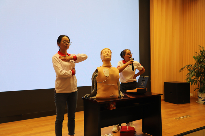 活动进入第二部分,红十字会急救指导老师展示并讲解了心肺复苏术(CPR)+自动体外除颤器(AED)的操作流程,强调AED使用的注意事项及其重要性,AED的普及和使用可以最大限度提高心源性猝死患者的急救成功率,唐老师还重点说明了救治“黄金四分钟”。
