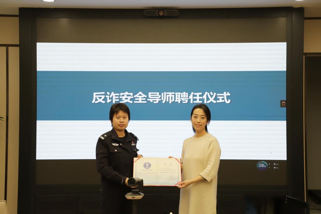 反诈安全导师聘书,为杨恺颁发校外兼职辅导员聘书,希望在雪浪派出所民警的支持和帮助下,学院能够不断完善反诈防骗与法制教育工作,持续提高学生的反诈积极性和强化学生自身的法制观念,共建平安和谐校园。