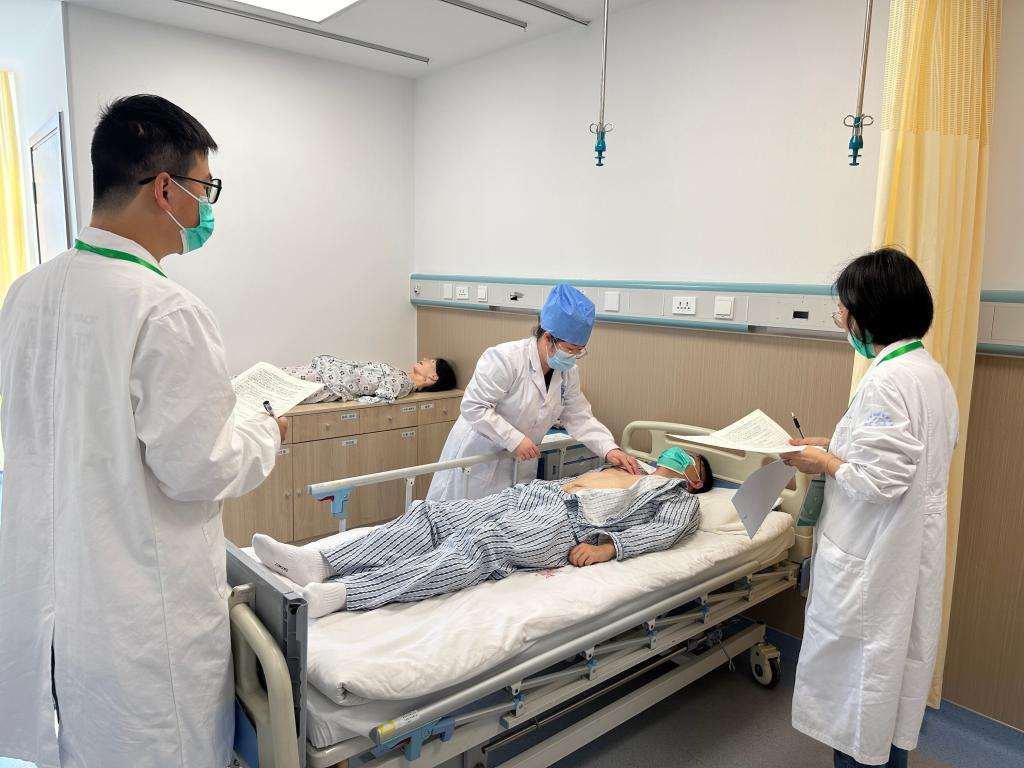 附属中心医院为首次参加。临床技能考试共设置6个考站,主要考查病史采集、体格检查和基本技能操作,同时对沟通交流能力、人文关怀等职业素质进行评价。病史采集部分,学生与标准化病人(SP)进行沟通交流,考核方式为口试;体格检查部分,学生在标准体检者身上完成操作考试;基本操作部分,学生在模拟人上进行基本技能操作。