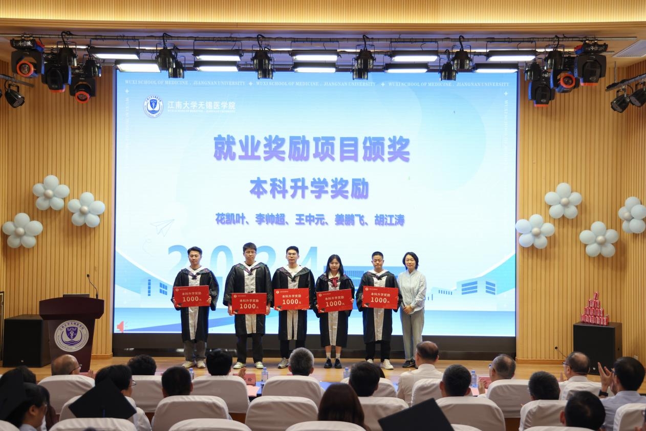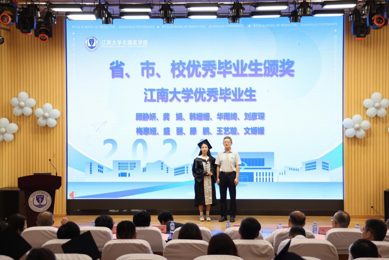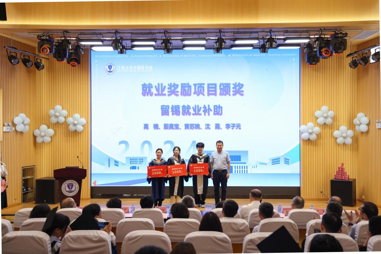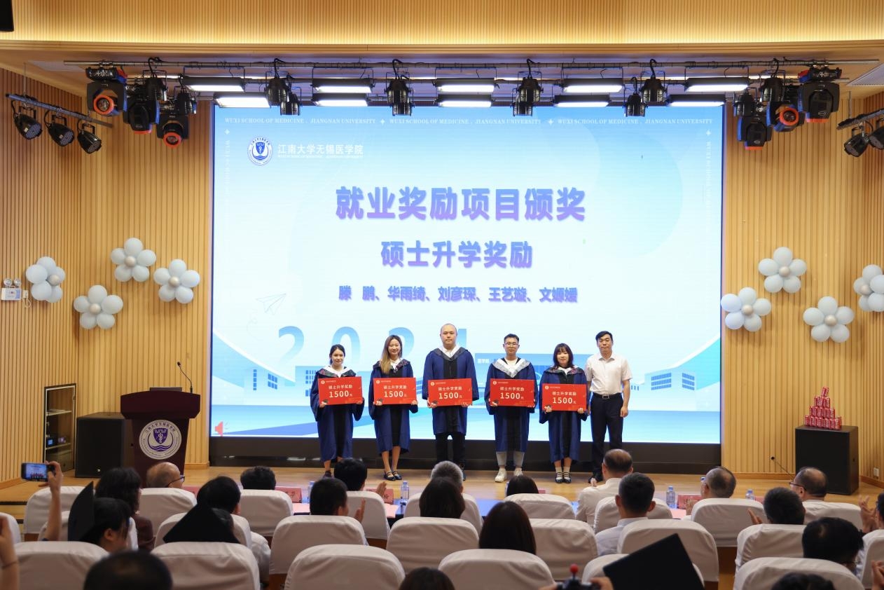 优秀研究生毕业生颁奖,奚晓岚、柴高尚、赵鹏分别为本科升学代表、硕士升学代表和留锡就业代表颁发升学就业奖励补助。程洋、徐德武、姜宇、潘礼龙、蒋玉宇、吴郁为毕业生代表发放毕业纪念品并送上祝福。