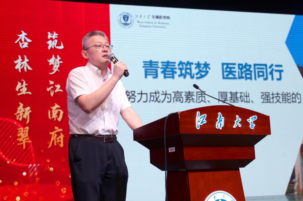 笪学荣致辞欢迎全体医学新生们的到来,他首先向同学们介绍了无锡的经济建设、历史文化、人文底蕴等方面情况,并详细讲述了无锡卫生健康事业的发展情况,他强调在市校共建机制保障下医学教育与医学人才培养取得新发展,已实现无锡本地医学本-硕-博一体化人才培养通道,他寄语桃花视频