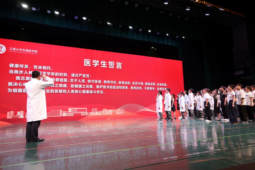 2023-2024学年医学院优秀教师、优秀临床带教老师、优秀教学集体、优秀科创指导教师、优秀班主任、优秀辅导员代表共同为本科生、研究生新生代表佩戴“江南医学人”院徽、授予听诊器。