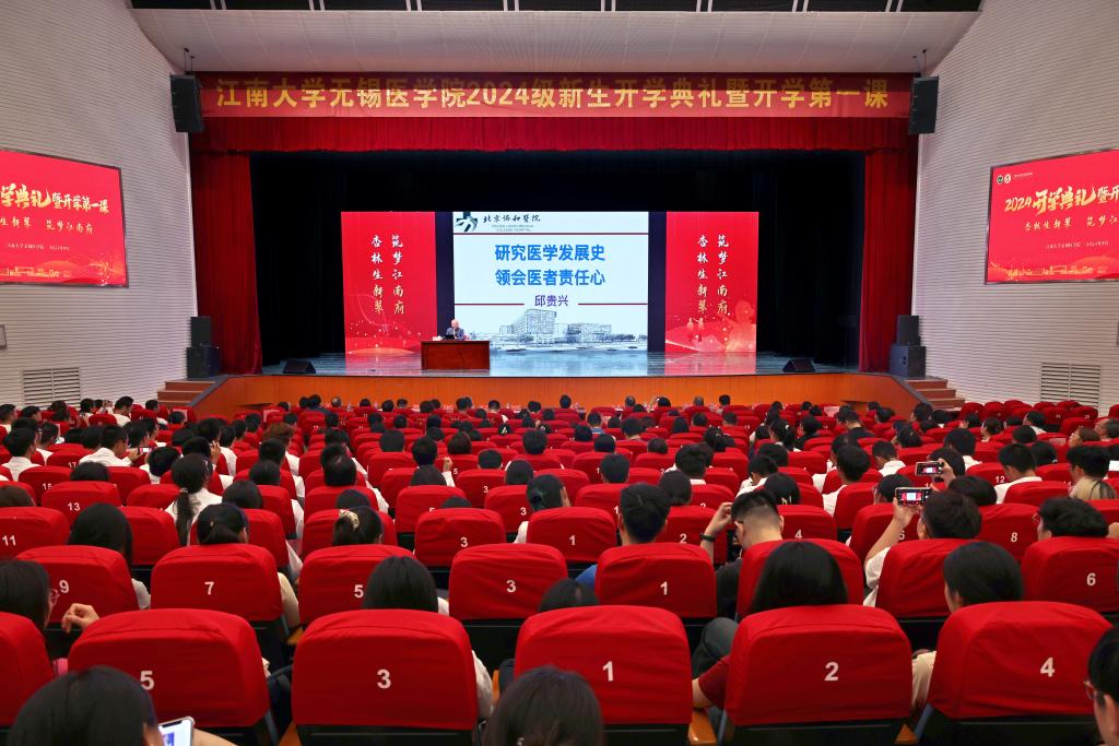 开学典礼之后,邱贵兴院士随即为全体2024级新生和医学院、附属医院的教师带来题为《研究医学发展史 领会医者责任心》的开学第一课。