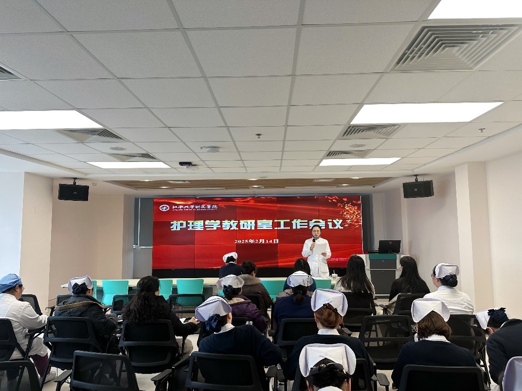 护理系联合在附属医院综合楼701会议室召开了2025年新学期首次护理学教研工作会议。会议由附属医院护理部副主任顾丹凤支持,护理部主任王慧虹、护理系主任蒋玉宇、护理部教学管理人员、临床课程负责人与核心教师、护理系各教研室主任及护理系骨干老师30余人参加了此次会议。