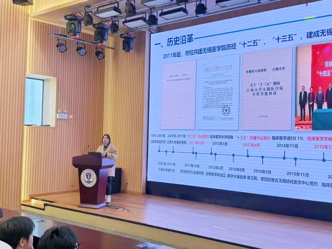 活动伊始,医学院党委书记向琪热情致辞,她介绍了学院“医工结合、学科交叉”的创新特色,鼓励大家成为生命守护者,寄语同学们“坚定信念,投身医学事业”,并表示作为一所无锡家门口的优质医学院校,医学院始终敞开怀抱,期待青年学子在这里找到人生方向。接着,王小英副教授以"医学学习与职业发展"为主题,阐述了医生的职业内涵,指出医生不仅是经过长期专业训练的健康守护者,更是集疾病诊疗、预防保健、健康教育和公共卫生等多重职责于一身的专业人才。“医学之路虽充满挑战,却意义非凡。”王老师回顾了学院的办学历史,介绍了学院及附属医院专业的师资力量、先进的教学设施与科研平台,并以学院临床医学本硕博一体化教育体系为例,介绍了医学人才培养的完整路径:5年本科教育夯实基础,3年住院医师规范化培训锤炼技能,以及后续专科医师培训持续精进专业能力。“终身学习是医学从业者的必备素养,从基础医学到临床医学,每一门课程都是通向医学高峰的必经之路。”