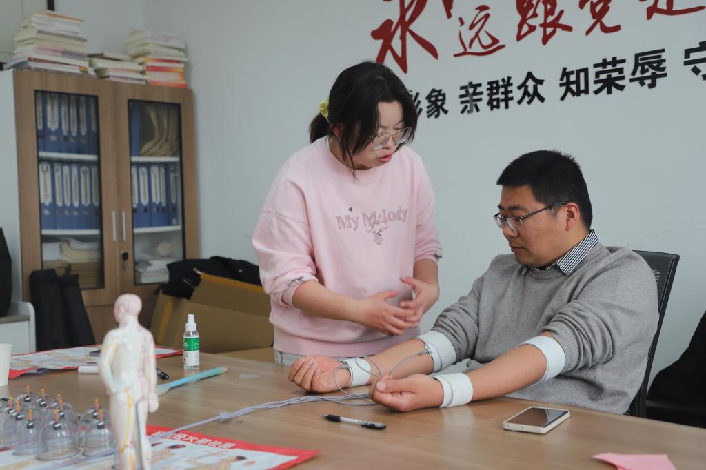 由上海市针灸经络研究中心医师团队同步开展的针灸理疗服务通过脉诊、舌诊、面诊等中医技法,结合艾灸、推拿,帮助老师们缓解肩颈劳损、亚健康等问题。活动现场排起长队,大家对送上门来的服务感到温暖又贴心。