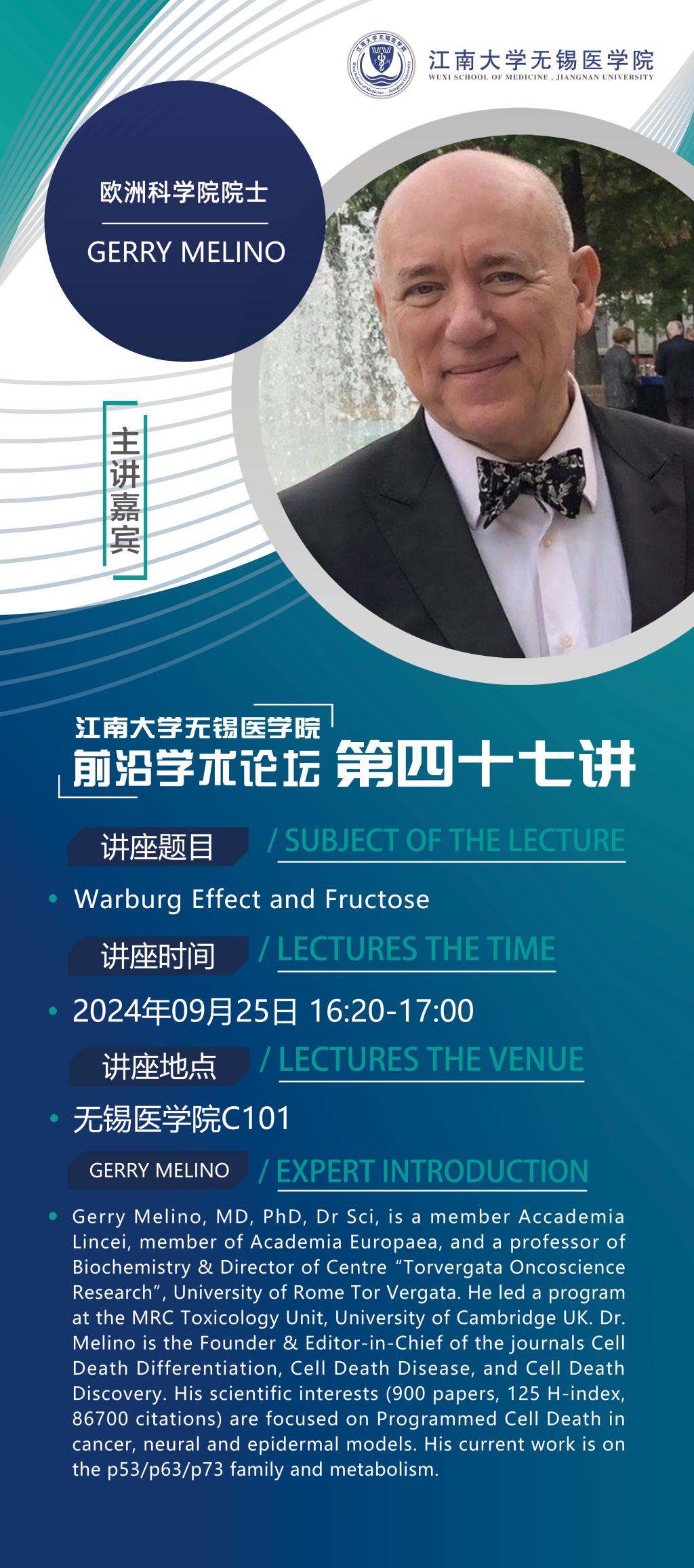 9月25日 时玉舫:间充质干细胞与肿瘤炎症微环境 Gerry Melino:Warburg Effect and Fructose