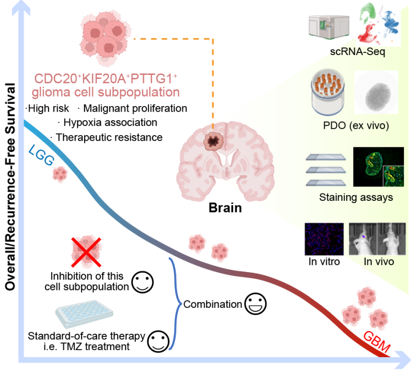 附属中心医院鲁晓杰教授/崔凯飒副研究员团队联合首都医科大学附属北京天坛医院在《Advanced Science》发表了题为“The Hypoxia-Associated High-Risk Cell Subpopulation Distinctly Enhances the Progression of Glioma”的研究性论文(医学院在读博士生万权为论文共一第一作者)。该研究揭示了一种在胶质瘤进展中可能起关键作用的新型低氧高风险胶质瘤细胞亚群,该亚群还可能抵抗胶质瘤标准治疗从而导致疾病复发。该研究为针对胶质瘤进展的治疗策略提供了新的见解,解析并精准抑制特定细胞亚群来增强现有标准治疗效力,从而减缓甚至阻止早期胶质瘤发展为晚期疾病可能是一种有前景的治疗方案。