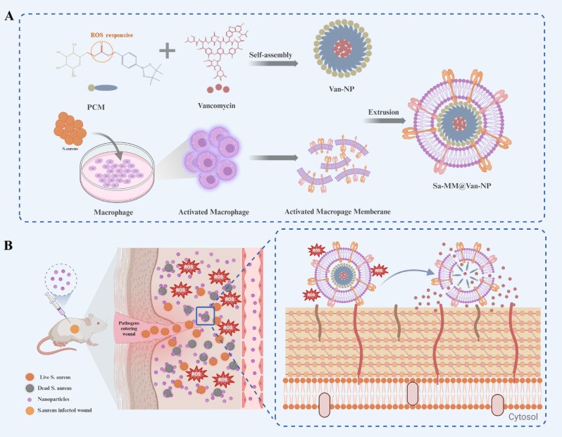 医学院吕国忠教授团队在《Journal of Nanobiotechnology》期刊,发表了题为“Bacteria-activated macrophage membrane coated ROS-responsive nanoparticle for targeted delivery of antibiotics to infected wounds”的研究论文,该研究利用巨噬细胞识别细菌的天然能力以及感染部位活性氧(ROS)增加的特点,开发了一种用于靶向递送和控制释放的新型纳米颗粒Sa-MM@Van-NPs。该纳米颗粒能够有效地靶向感染部位并释放万古霉素以消除细菌,促进伤口更快愈合,并且具有良好的生物相容性,有望成为精准根除感染和促进伤口愈合的有力策略。