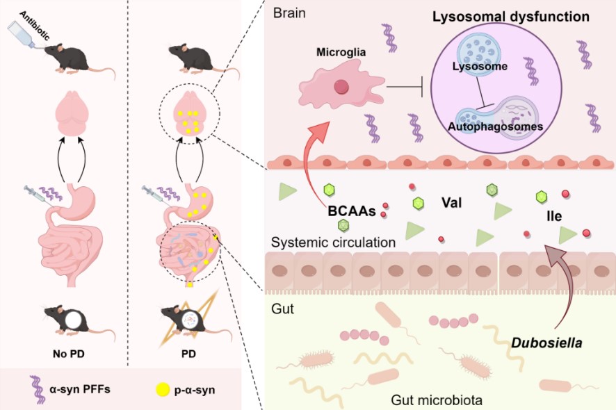 医学院申延琴教授《Brain Behavior and Immunity》发表了题为“Gut microbiota promote the propagation of pathologic α-syn from gut to brain in gut-originated Parkinson's disease model of mice”的研究性论文。肠道菌群和α-syn传播被证实是帕金森病发展的关键因素,虽然肠道是α-syn病理的起源之一,但肠道菌群如何调控肠起源α-syn病理发展并不明确。该研究首次揭示了肠道菌群在肠起源帕金森病中的动态变化规律,首次证实肠道菌群(尤其是Dubosiella)是推动α-syn病理从肠到脑传播的关键因素,其通过BCAA代谢紊乱导致溶酶体功能障碍,最终加剧α-syn聚集。这一发现为PD的早期干预提供了新靶点:调控肠道菌群或靶向BCAA代谢可能成为延缓PD进展的有效策略。