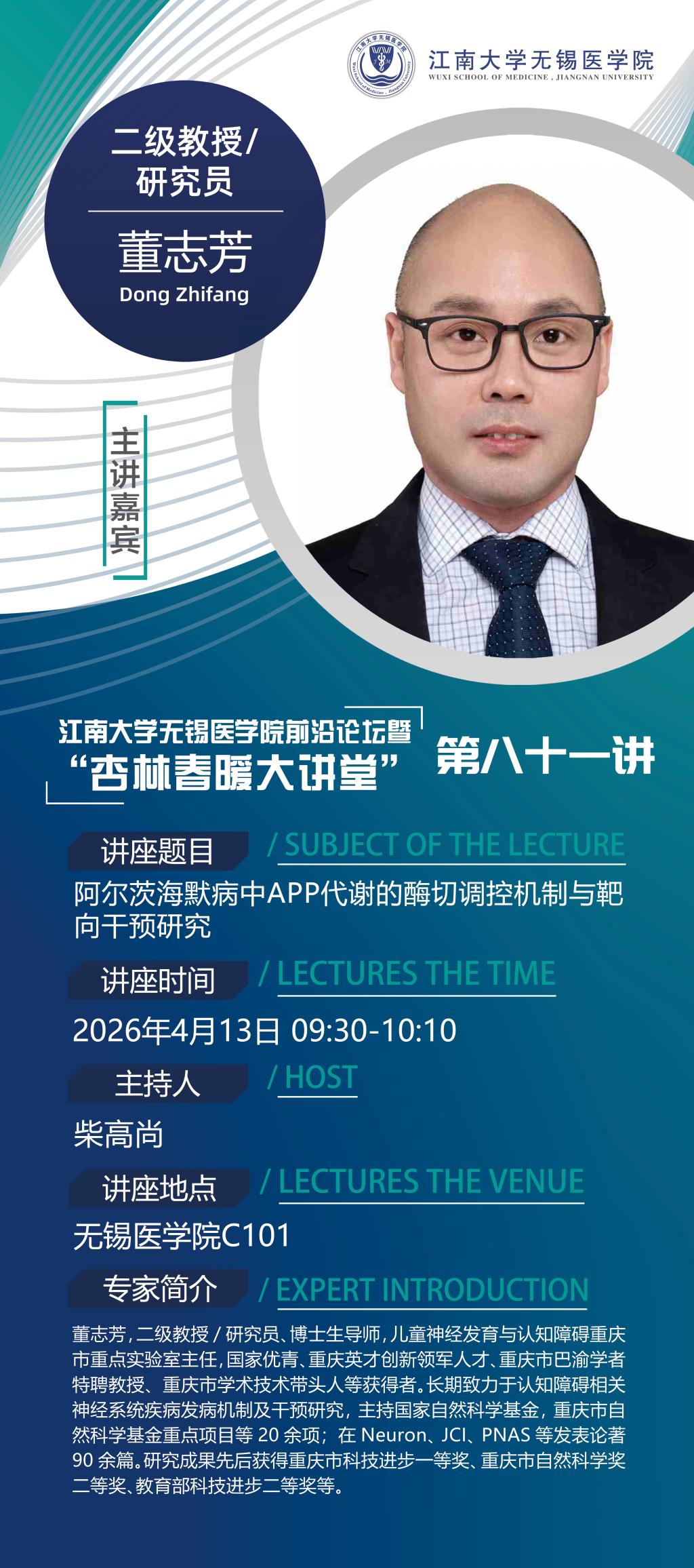 嘉宾简介:董志芳,二级教授/研究员、博士生导师,儿童神经发育与认知障碍重庆市重点实验室主任,国家高级别人才、重庆英才创新领军人才、重庆市巴渝学者特聘教授、重庆市学术技术带头人等获得者。长期致力于认知障碍相关神经系统疾病发病机制及干预研究,主持国家自然科学基金,重庆市自然科学基金重点项目等20余项;在Neuron、JCI、PNAS等发表论著90余篇。研究成果先后获得重庆市科技进步一等奖、重庆市自然科学奖二等奖、教育部科技进步奖二等奖等。