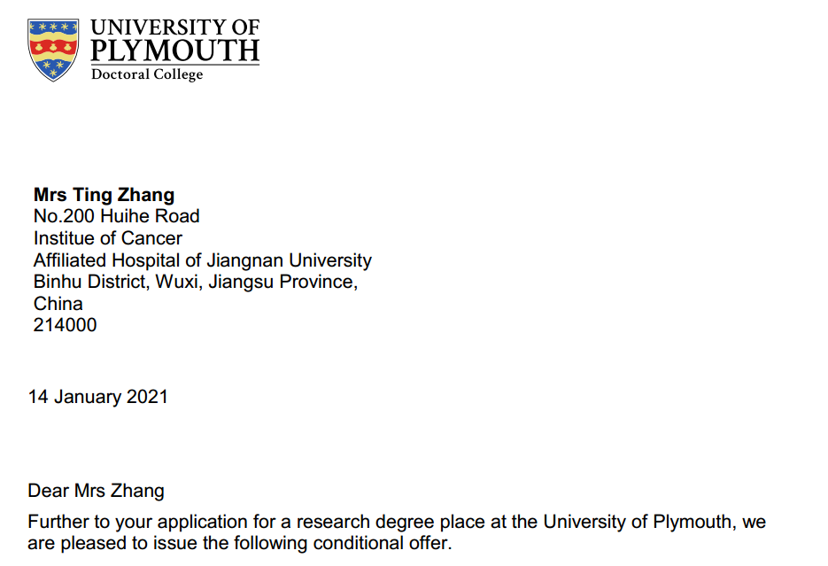 附属医院心内科杨瑞晨和肿瘤研究所张婷两名职工成为该项目第一批培养对象,顺利被英国普利茅斯大学正式录取,即将攻读生物医学博士研究生。