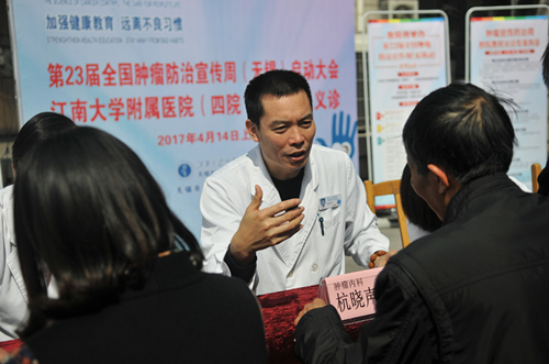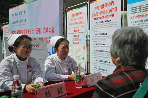 随后,在无锡市名医、无锡市肿瘤学首席医师、附院(四院)肿瘤科华东教授带领下,肿瘤内科、肿瘤放疗科、中西医结合肿瘤科、肿瘤妇科、胃肠外科、甲乳外科、胸心外科、消化内科及放射介入科等科室的15位专家,齐聚广场,开始了大型惠民义诊活动。现场众多患者和市民将专家团团围住,趁这次难得的机会寻医问诊,专家们都十分耐心的解答患者疑问,提供专业的健康咨询和指导。