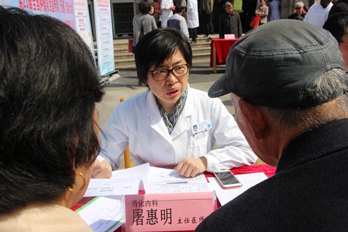 做了内镜下肠息肉活检,在报上看到义诊活动后,特意赶来,向义诊专家消化内科屠惠明主任咨询。屠主任就下一步用药进行了详细指导,怕老人忘记,还在纸上一一写下。