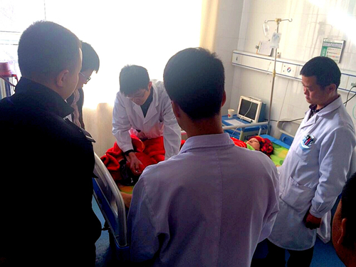 3月中旬的一个周末,医院急诊科来电有抢救病人,吴丹岭和无锡市中医院急诊科的吴海荣医师一起,立即从驻地出发,冒着风雪交加的恶劣天气,赶到急诊科。患者是一名柯族老人,长期慢性支气管炎急性发作,导致呼吸衰竭、全脑功能损害,送来时意识模糊,口唇发紫……见状,吴丹岭和吴海荣医师立即组织当班医护人员展开抢救:开放静脉通道保证用药安全、血气分析、并首次运用无创呼吸机辅助通气……经过2个多小时的全力救治,老人神志转清,生命体征平稳,转危为安。